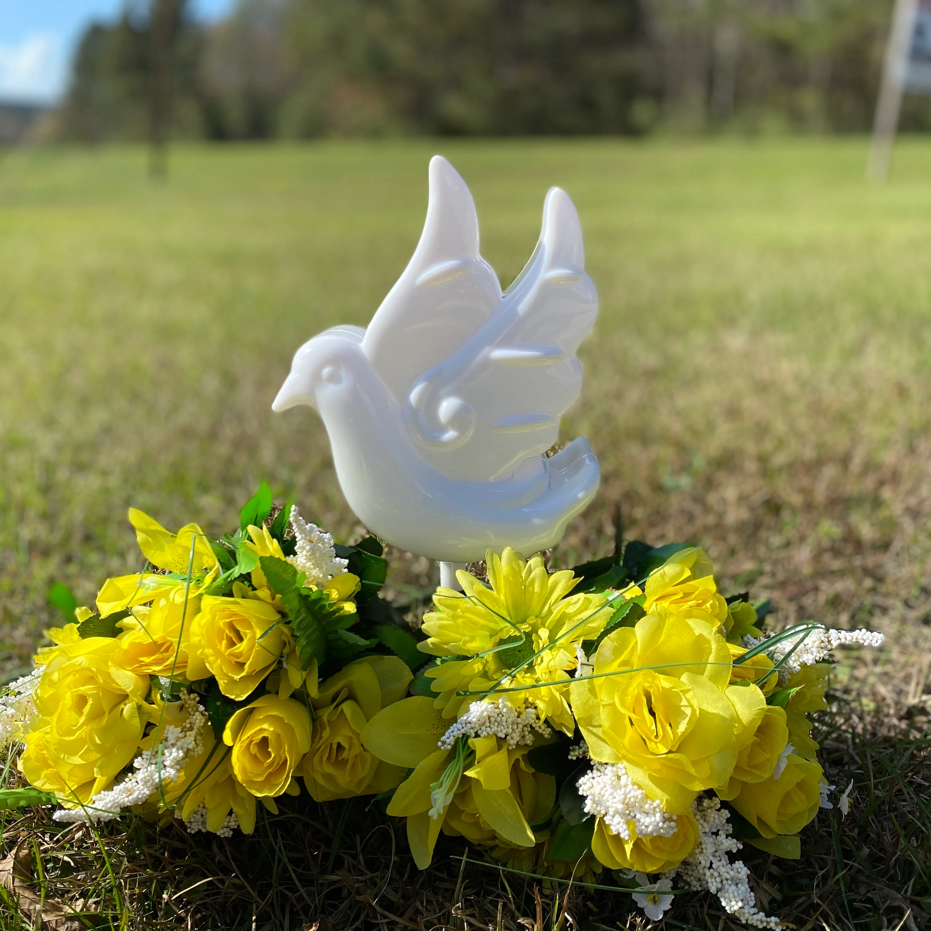 Perfect for cemeteries, memorial gardens, or special places of remembrance, the Eternal Light Dove brings serenity and warmth to any setting. It lights up every evening, shining through the seasons as a symbol of hope and love. Standing 10" tall, it comes with a stake for secure placement and includes two solar rechargeable batteries for continuous glow.